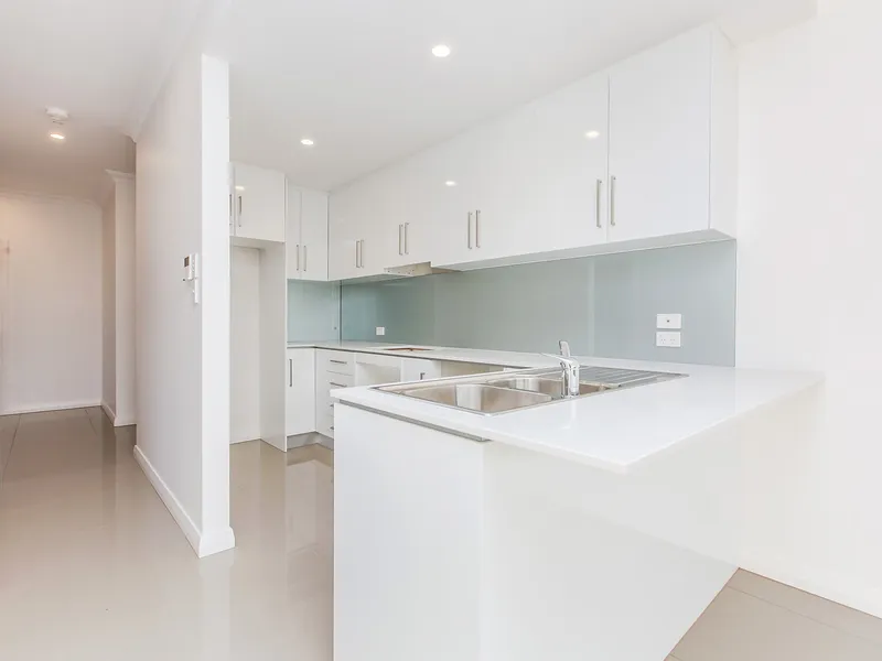 •Sleek modern kitchen with stone bench top, glass splashback, dishwasher and gas cooktop