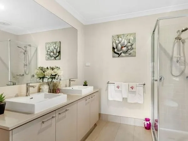 • Luxurious master ensuite with double vanity, stone benchtops, and full-size shower