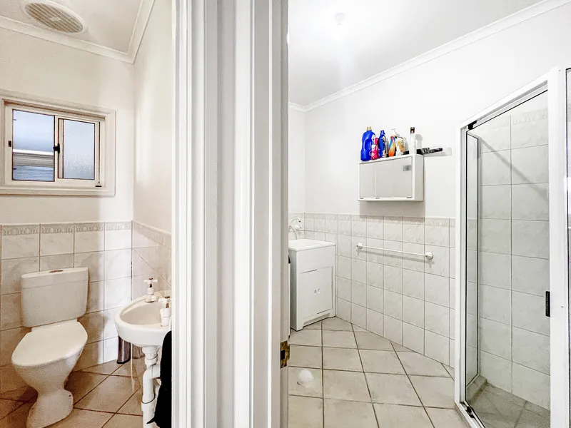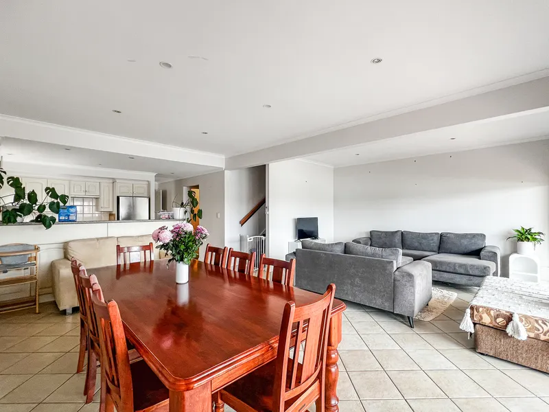 Downstairs, the home offers generous living spaces designed for both relaxation and entertaining. The spacious open-plan living and dining area provides a welcoming environment to gather with family and friends or simply unwind after a long day. The space has a split system to ensure comfort during all year round. Overlooking this space is a well-equipped kitchen featuring an electric cooktop and oven, dishwasher, and ample bench and cabinetry space to make everyday living easy.