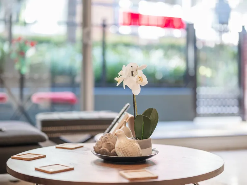 You’ll be treated to a view of the outdoors from here via floor-ceiling glass windows, and doors that open to a fenced outdoor terrace area with quaint table and seating for two (perfect for a morning coffee or evening drink).