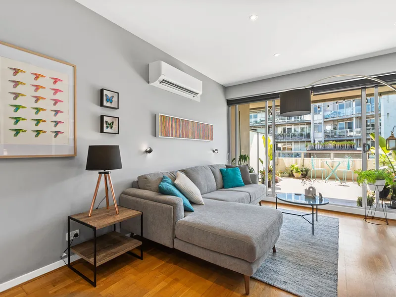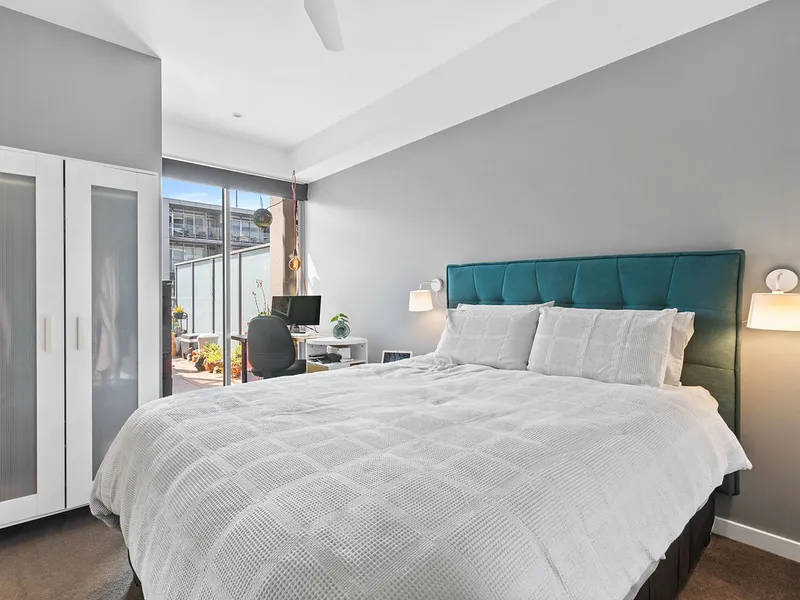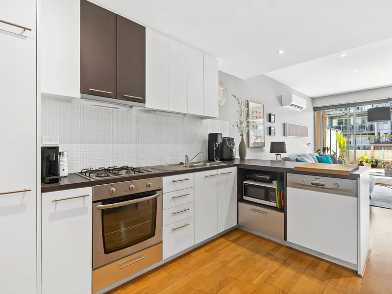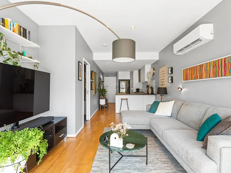 This brilliant 4th level one bedroom apartment is situated in a modern, low rise building. Step into a quality apartment with an abundance of natural light and an open plan and spacious living room, combining a meals/dining area with split system heating and cooling, floating floor boards and access to the very generous balcony – perfect for entertaining this summer.