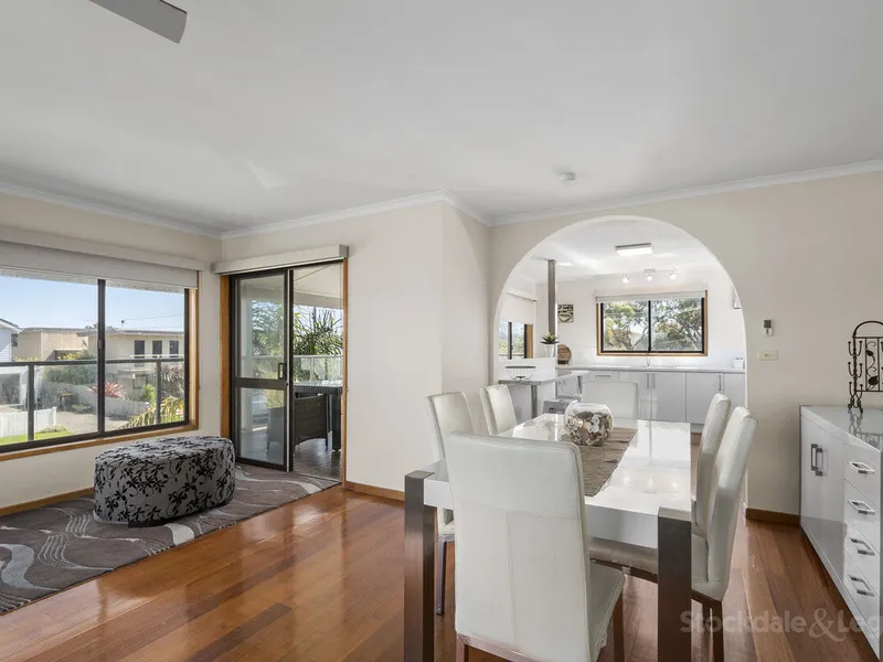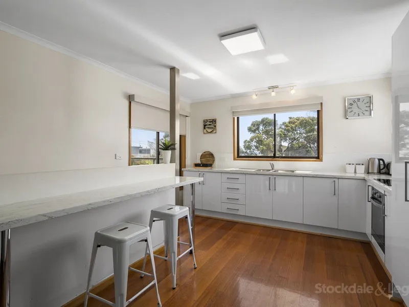 Welcome to 56 Seaforth Drive, Portarlington - a seaside three bedroom home that offers a modern reverse living layout, perfect for maximizing light, space, and views. Upstairs, you'll find a spacious open plan kitchen, dining, and living area that seamlessly flows out to a private balcony, where you can enjoy relaxing glimpses of the bay. Split system heating & cooling services the upstairs living area.