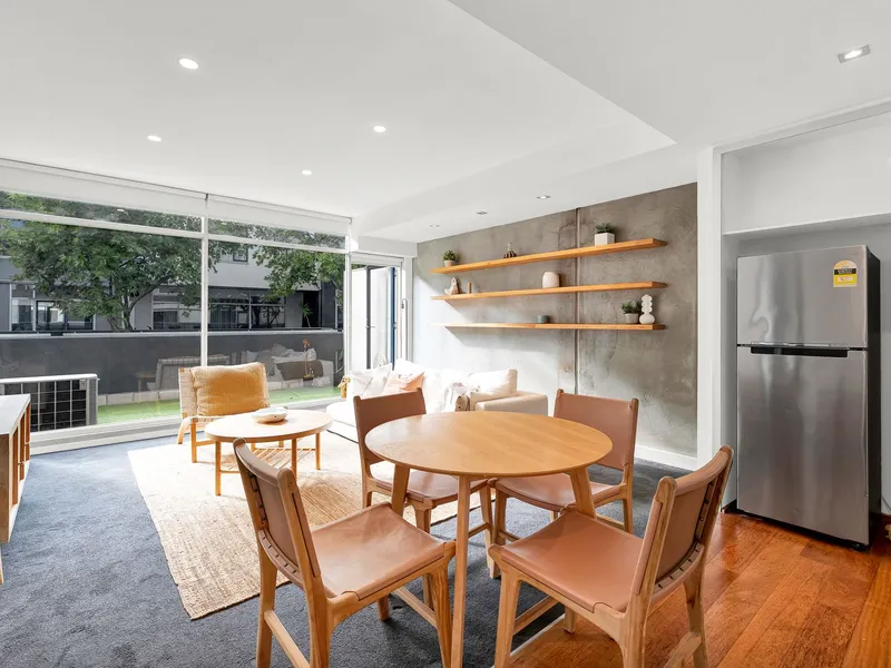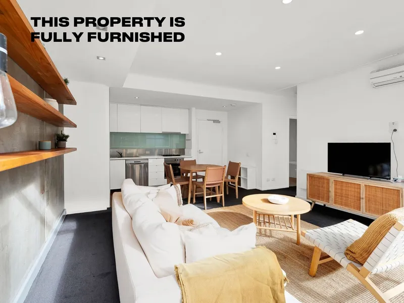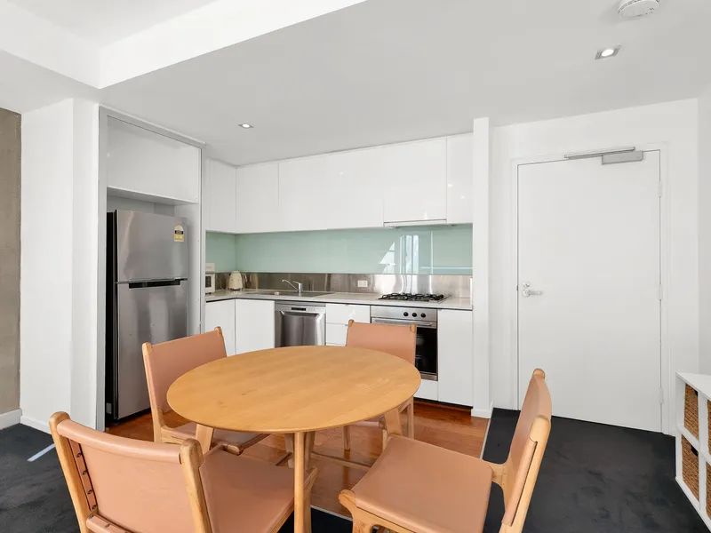 Filled with beautiful natural light through floor to ceiling windows, the open plan living/dining enjoys a spacious setup and showcases a raw concrete feature wall, opening seamlessly to the almost 20 sqm balcony spanning the length of the apartment, you can entertain guests in style.