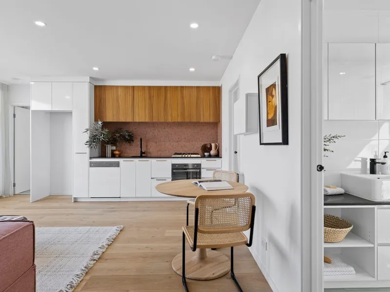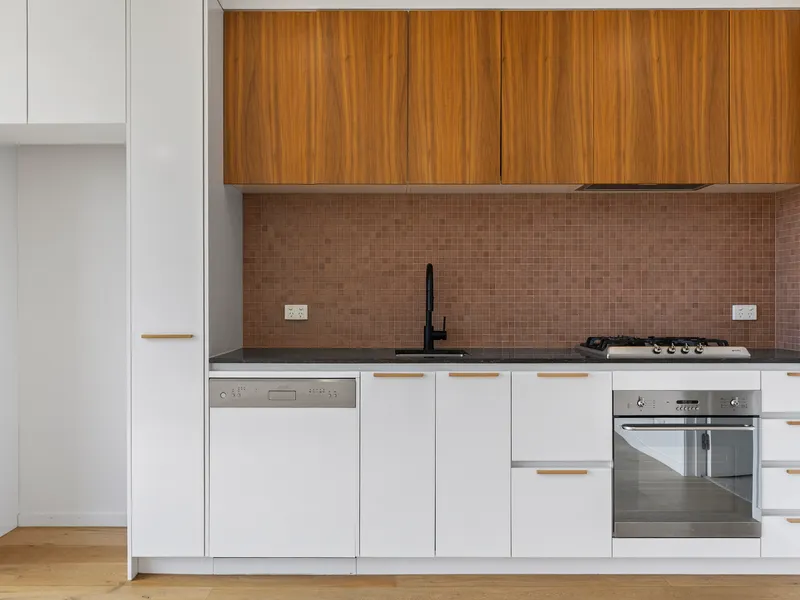 The contemporary kitchen is designed for both style and functionality, featuring quality Smeg appliances, ample storage and a striking feature splashback. Timber flooring adds warmth to the living zone, while the bedrooms are fitted with plush wool carpet for comfort.