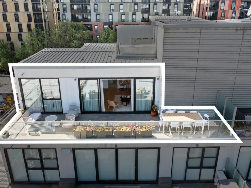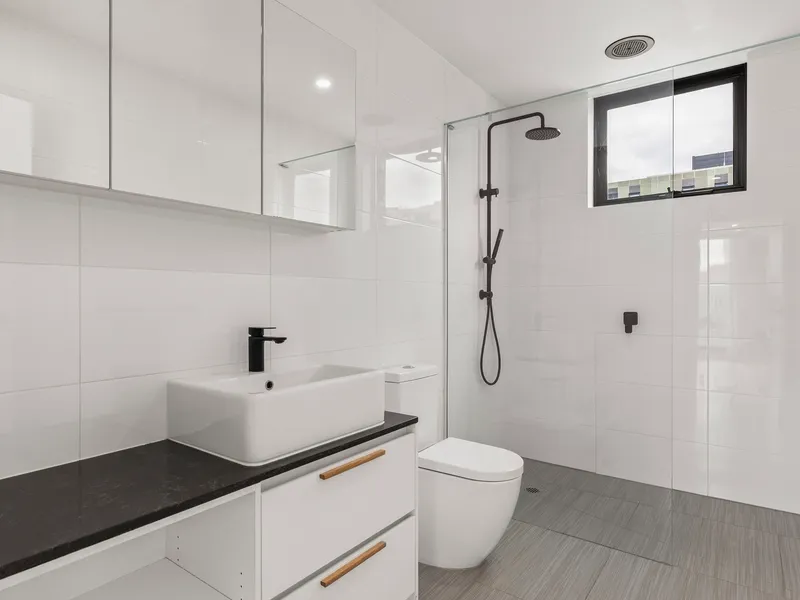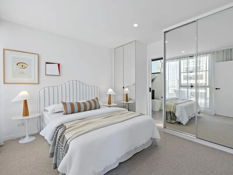 All three bedrooms include mirrored built-in robes, and the apartment is complemented by two fully tiled bathrooms with walk-in showers and premium finishes. Additional features include a discreet European laundry, split system heating and cooling, a secure car space and a storage cage. Residents also enjoy access to a communal rooftop terrace with barbecue facilities and panoramic views.