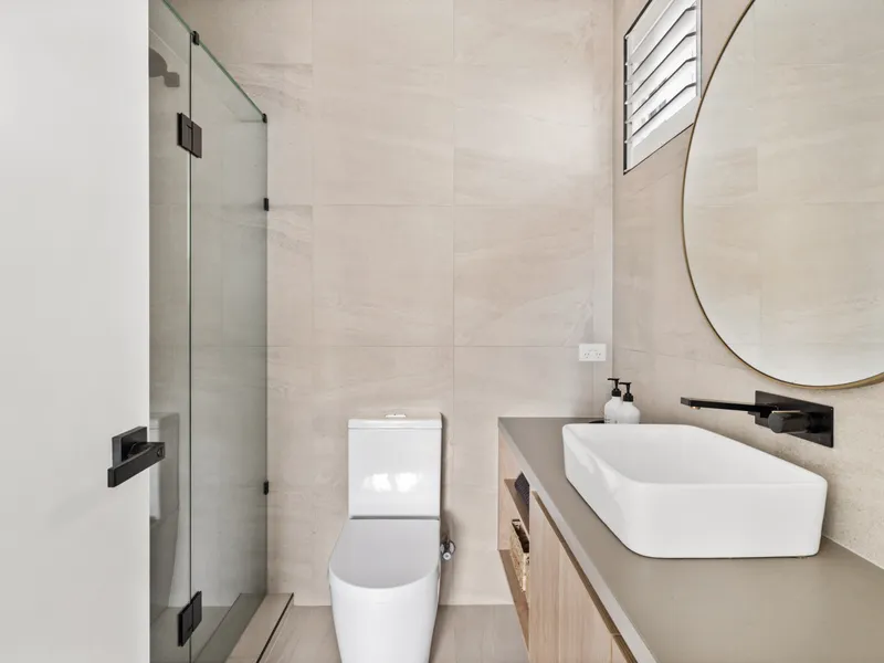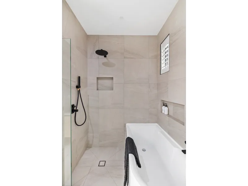 Upstairs, the accommodation comprises three generously sized bedrooms, each equipped with individual heating and cooling, built-in robes, and a modern central bathroom with luxurious stone finishes and a bathtub. The spacious main bedroom boasts an elegant ensuite , built-in robes, and a private balcony.