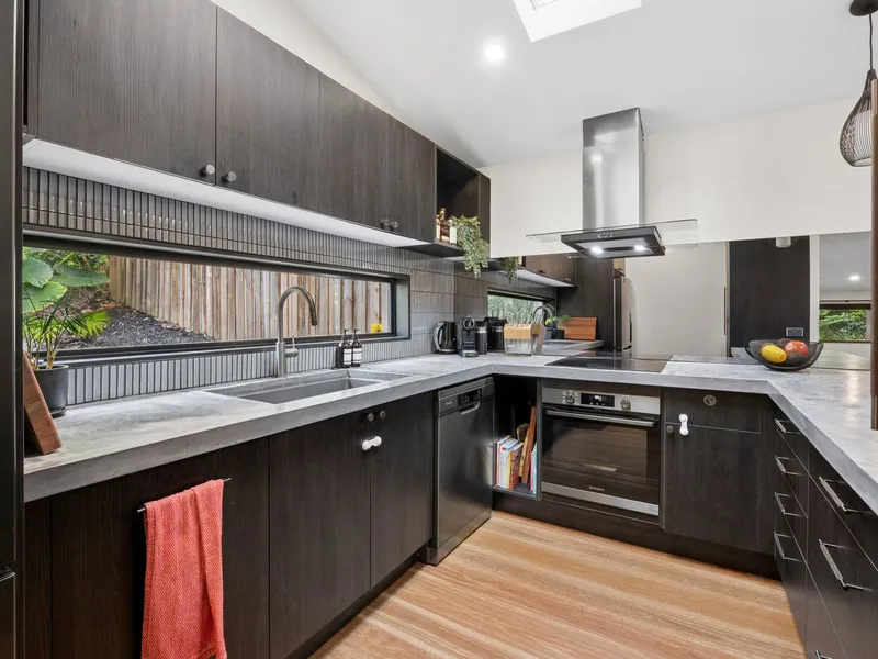 - Designer kitchen with concrete benchtops and integrated appliances