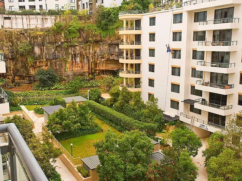 - East-facing balcony nestled on Level 5 of the building overlooking Miller Street, with views to Centre Point Tower, city skyline, and Blackwattle Bay, Glebe