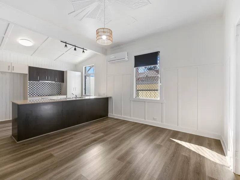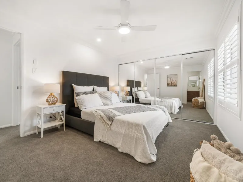 Inside, the home features two well-sized bedrooms, both fitted with mirrored built-in wardrobes, ceiling fans and plantation shutters. The main bedroom also includes a stylish ensuite complete with floor-to-ceiling tiling, large shower, vanity and circular mirror.