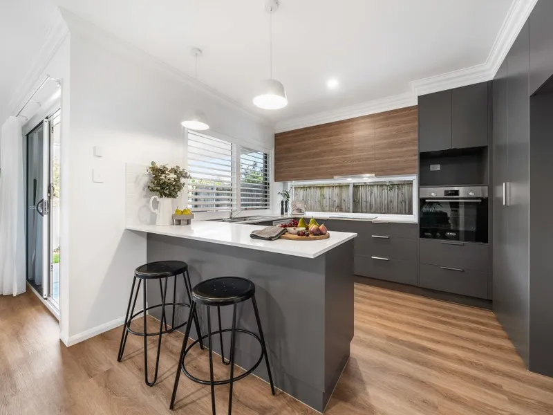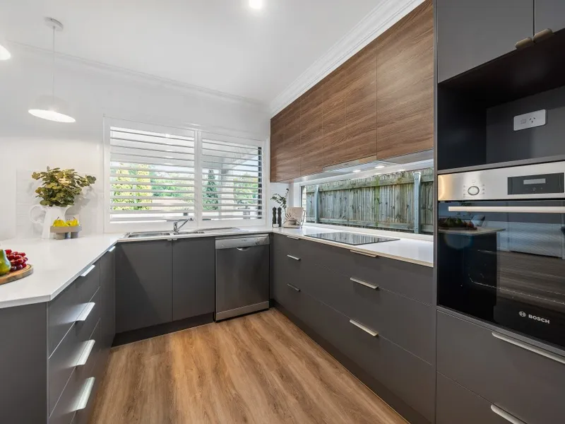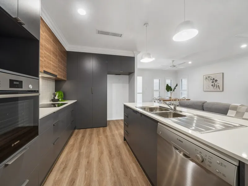 The designer kitchen is both functional and stylish, equipped with Bosch appliances including a wall oven, induction cooktop and dishwasher. Additional features include a two-bowl sink, breakfast bar, glass splashback, microwave recess and excellent drawer and cupboard storage.