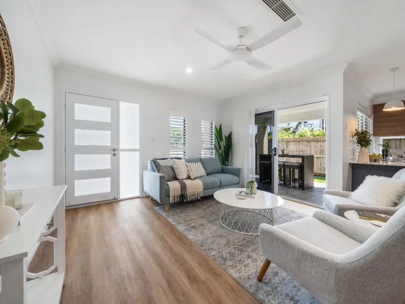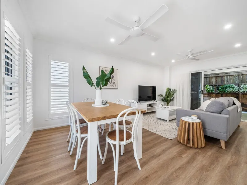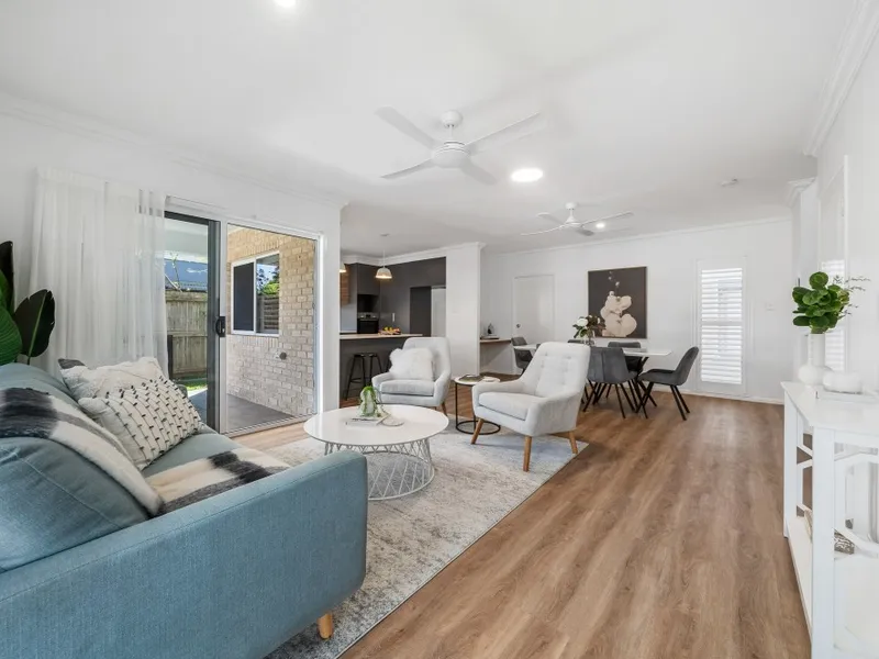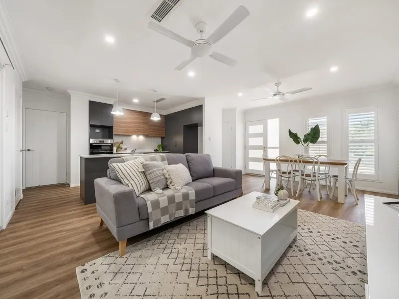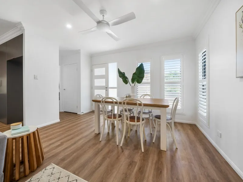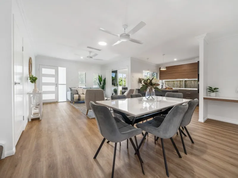 The light-filled open-plan living and dining area is designed for easy everyday living and features wood-look flooring, ceiling fan and ducted air conditioning for year-round comfort. This space flows seamlessly to the outdoor area, creating a relaxed indoor-outdoor connection.