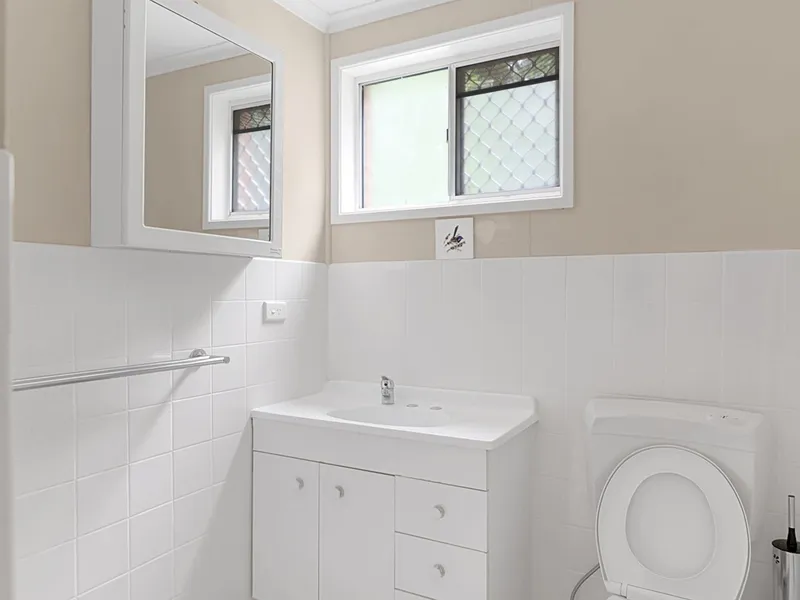 The modern main bathroom continues the high-quality finishes with floor-to-ceiling tiling, large shower, vanity, circular mirror and IXL heat light.