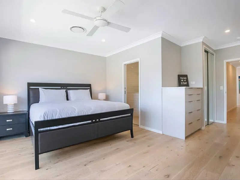 Upstairs, the home offers three spacious bedrooms, all fitted with ceiling fans and air conditioning to ensure year-round comfort. The master bedroom provides a private retreat with extensive mirrored built-in wardrobes and a beautifully appointed ensuite featuring double vanities. Two additional bedrooms also include built-in wardrobes and share a modern family bathroom (including bath).