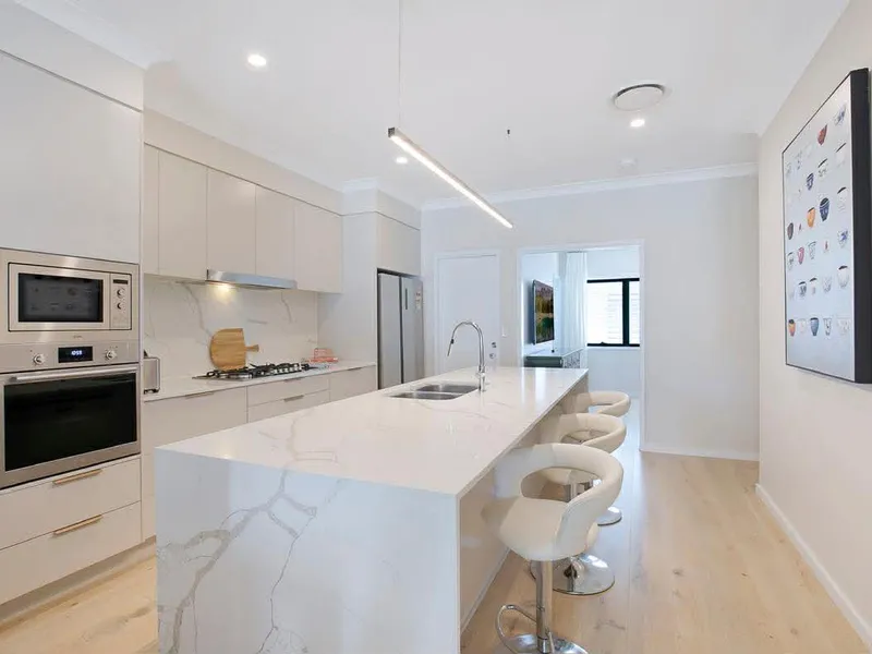 The main living level features an expansive open-plan kitchen, dining and living area that has been thoughtfully designed for both everyday living and entertaining. The living space flows seamlessly to a private outdoor area on the ground floor, creating a welcoming extension of the living zone and an ideal setting for relaxing or hosting guests. The well-appointed kitchen includes a concealed pantry, generous storage and ample bench space, making it both practical and stylish for daily use. At the rear of the main living level, a secondary living area provides a versatile additional space, complemented by a convenient powder room for guests.