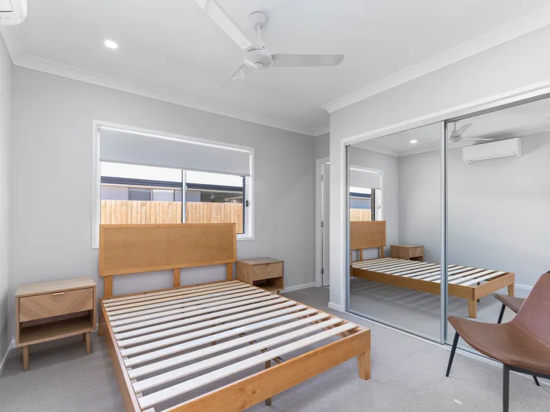- 1 good-sized furnished bedroom with queen bed (Mattress not included), 2 bedside tables, wall mounted tv, built-in wardrobes, Air conditioning & ceiling fan.