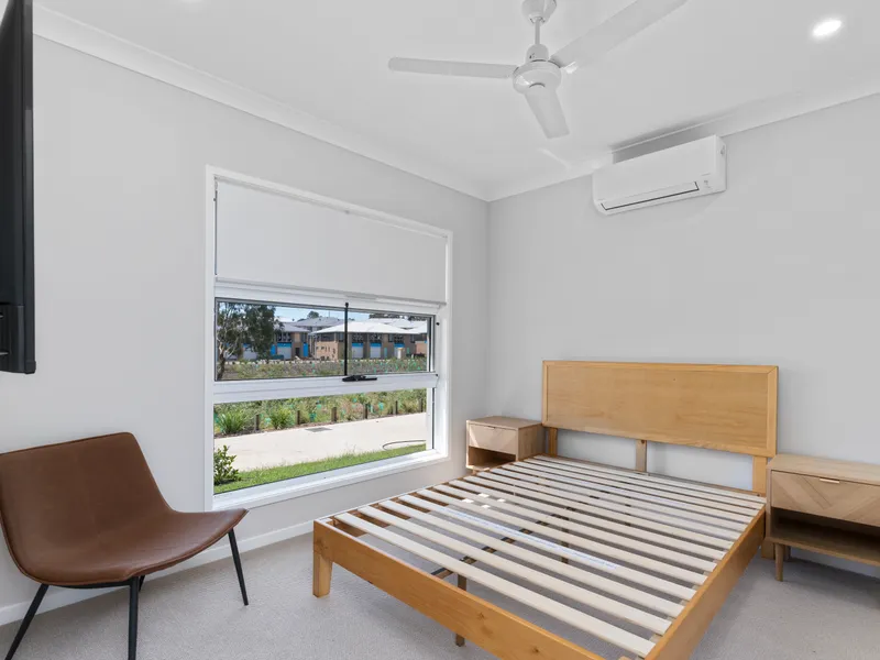 The lower level contains open plan living and dining, with a well-appointed kitchen that has a dishwasher and plenty of cupboard space. The entire lower level is air-conditioned. This all leads to onto your own private, covered, entertaining area and garden, which is maintained by the onsite manager. Secure car accommodation is provided with a double lock up garage.