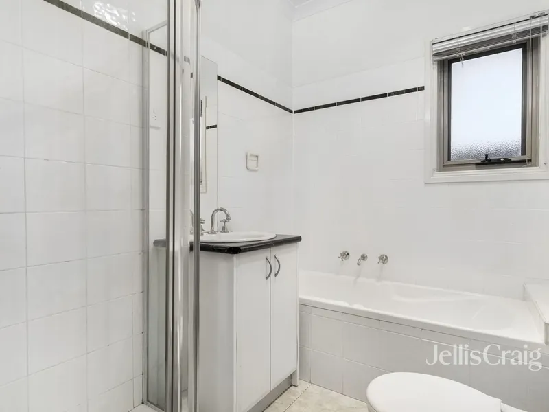The spacious bedroom includes double built-in robes, while the central bathroom is complete with a separate bathtub—perfect for unwinding at the end of the day.