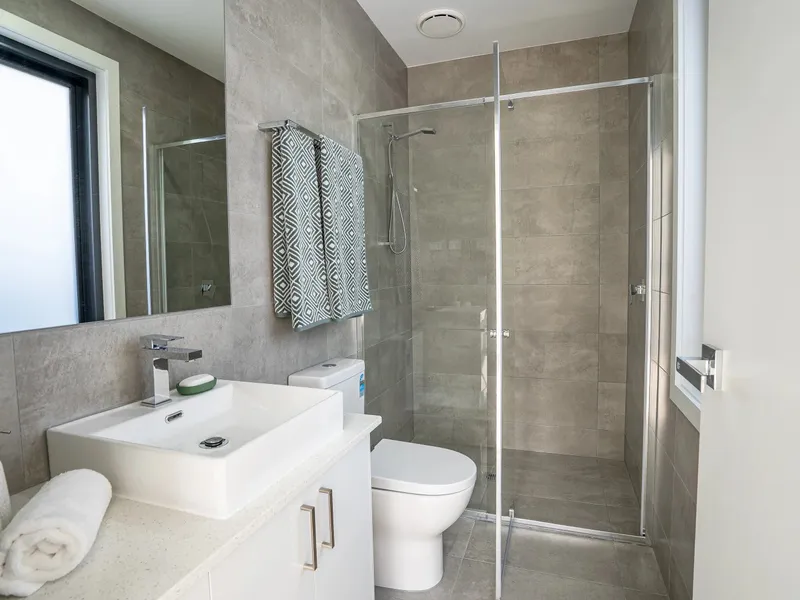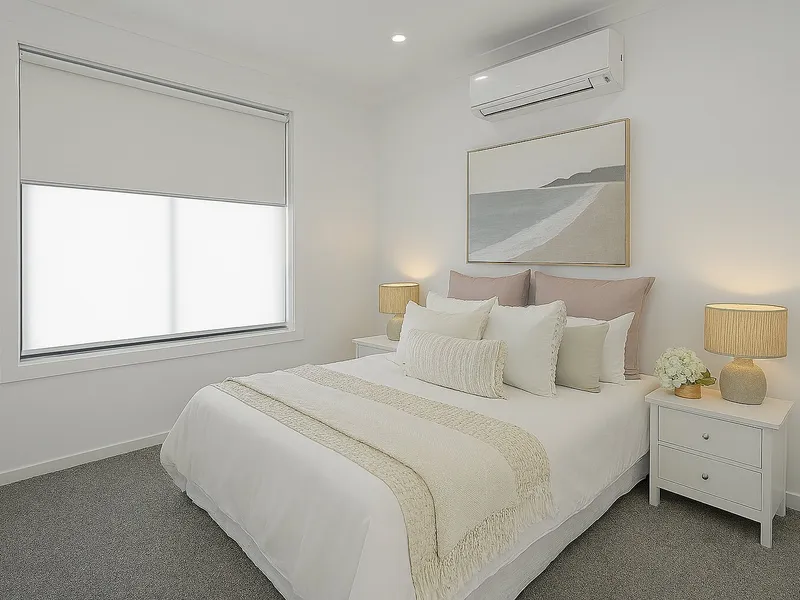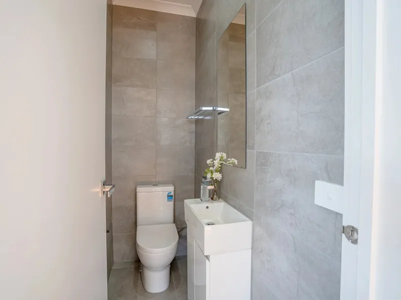 Accommodation includes two generously sized bedrooms, each with built-in robes and serviced by their own stylish bathroom, offering comfort and privacy. A sleek powder room adds further practicality for guests.
