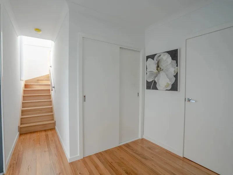Inside, high ceilings and light-filled interiors complement the warmth of timber floorboards, creating a welcoming and modern living environment. The spacious open-plan living and dining area is designed for easy living and flows seamlessly to a private balconyperfect for relaxing or entertaining.