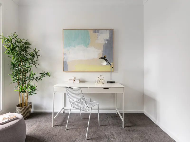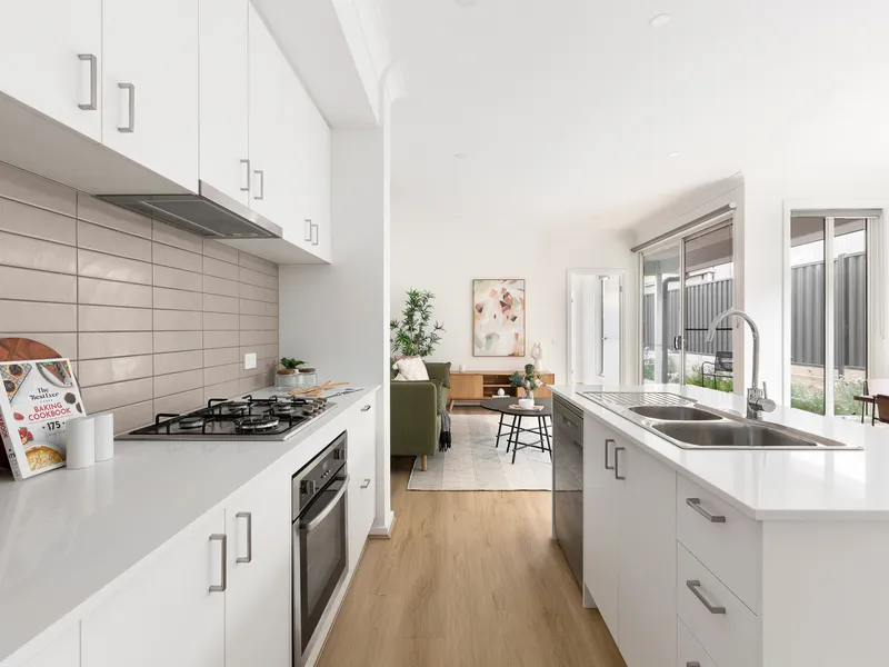 The open-plan family and meals areas complement an immaculate kitchen appointed with stone surfaces, walk-in pantry, island bench and premium stainless-steel appliances, before extending to a stylish undercover deck – perfect for seamless indoor-outdoor entertaining.