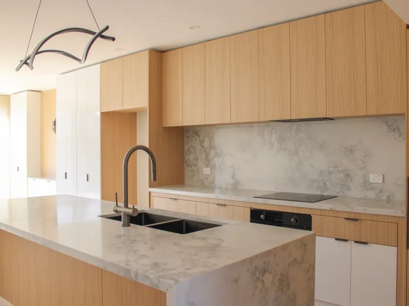 • Sleek kitchen showcasing quality benchtops, stainless-steel appliances and generous storage