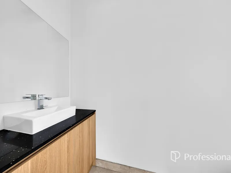 Beyond the bold architectural lines of its distinctive facade, discover a flawless interior comprising three bedrooms (downstairs master with BIR), together with a stylish ensuite, main central bathroom and guest powder room (third WC). Along with split-system heating and air conditioning across both levels, this feature-packed home also includes efficient LED lighting, premium Verasol blinds throughout, instantaneous gas hot water service and concealed laundry facilities. Double sliding doors from the living area lead out to a spacious north-facing courtyard and high fences for added privacy, plus a large landscaped front garden and a remote access single garage with internal entry.