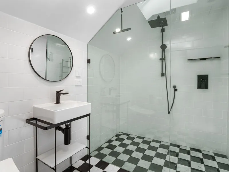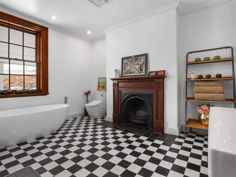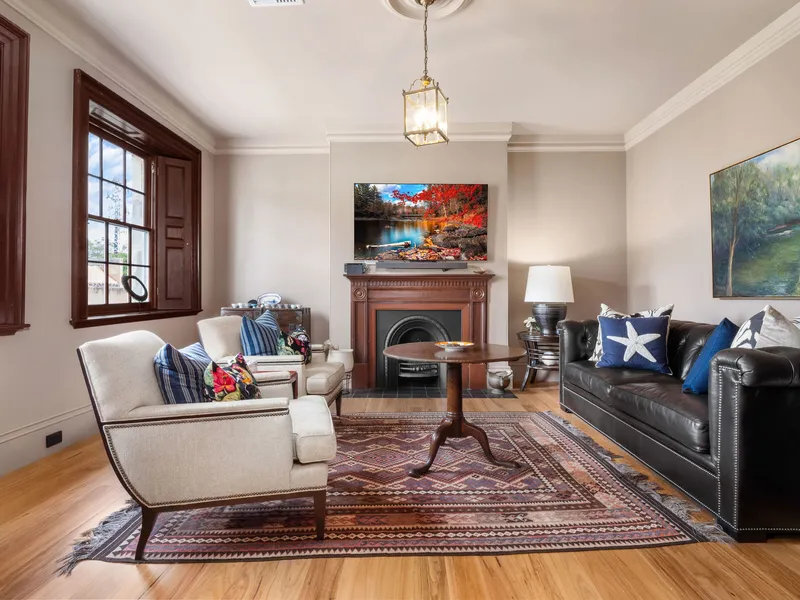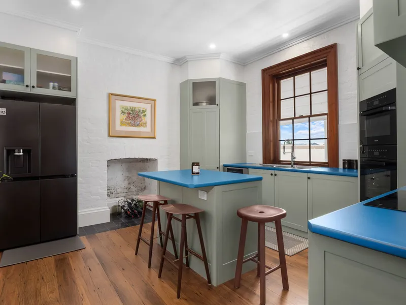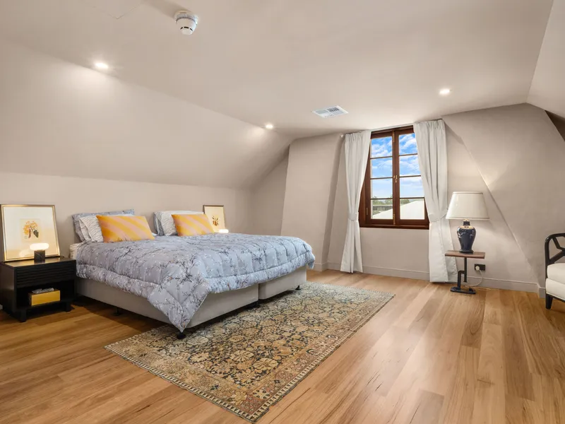Downstairs, the cedar staircase with an arched hallway opening creates a striking first impression, leading into two expansive living zones framed by original timber double-hung windows with cedar shutters. Solid timber floors flow throughout, enhancing the warmth and elegance of the interiors. The space is flooded with natural light and opens onto a North facing sun-drenched private balcony; perfect for a morning coffee.