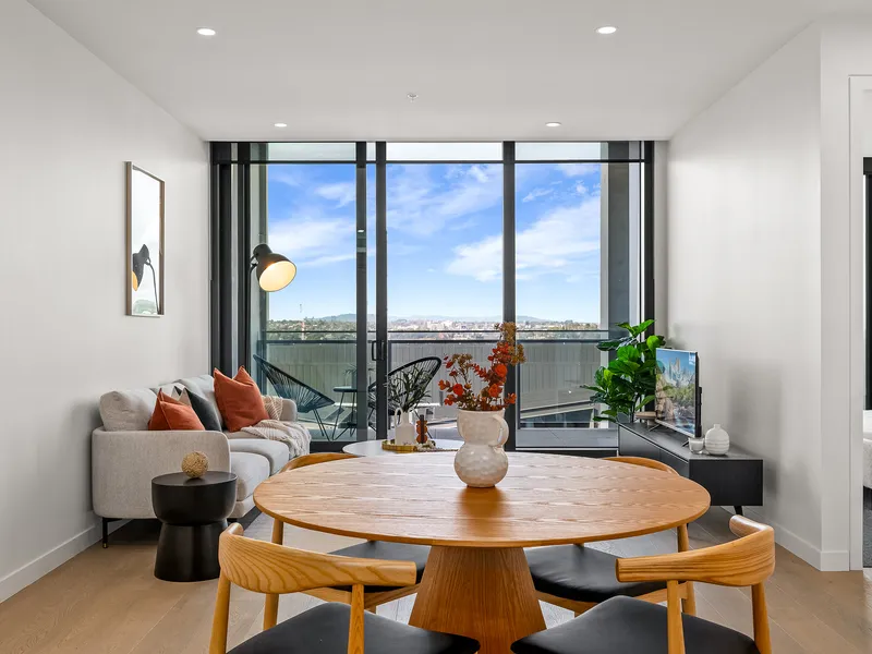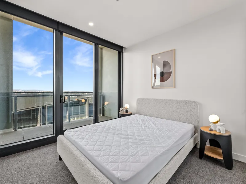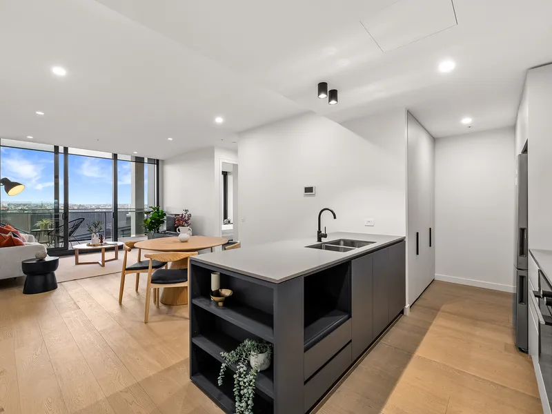 This luxurious 2 bedroom, 2 bathroom apartment offers a generous open plan living space with floorboards, spacious bedroom with full-size wardrobe, lavish bathroom with ample storage, and natural light with floor-to-ceiling windows.
