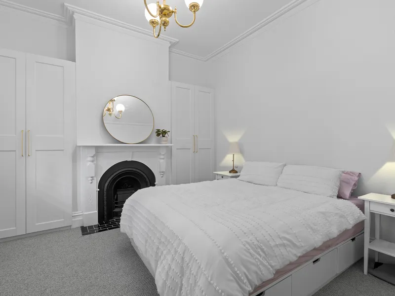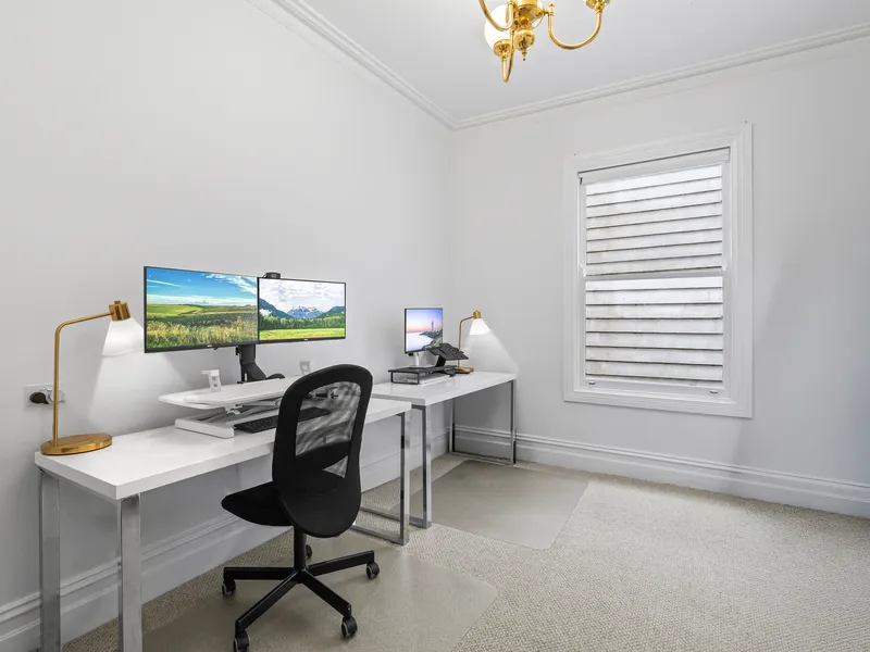 Both bedrooms offer plush carpet underfoot and built in robes for practical storage, while one bedroom features beautiful period detailing that adds to the home's timeless character. A versatile study nook provides flexibility for working from home, creative pursuits or additional storage.