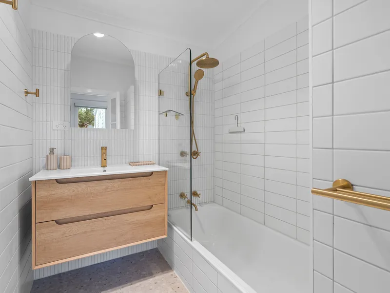 The renovated bathroom is a standout, featuring striking white finger tiles, warm timber cabinetry and brushed gold accents that add a touch of understated luxury. A bathtub with a handheld shower attachment offers the perfect place to unwind during Melbourne's cooler months.