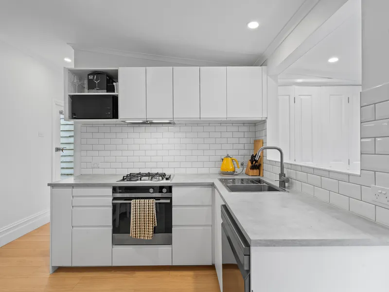 The kitchen is both stylish and practical, showcasing crisp white cabinetry, generous bench space and a smart layout designed for easy cooking and entertaining. Quality appliances including a dishwasher, fridge, microwave and kitchen essentials ensure everyday convenience.