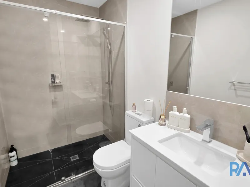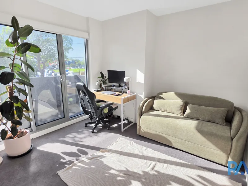 The apartment features two generously sized bedrooms, both with built-in robes. The master bedroom includes a private balcony and ensuite, while the second bedroom is serviced by a sleek, stone-finished central bathroom with toilet. A dedicated study nook provides the perfect space for working from home.