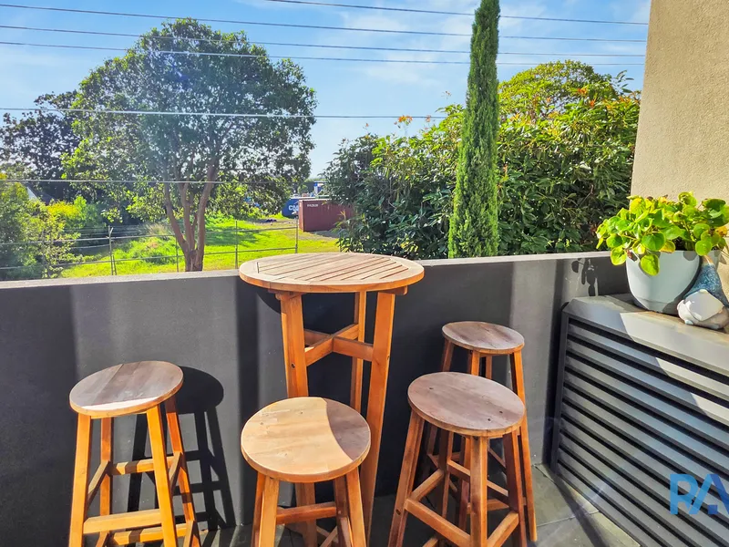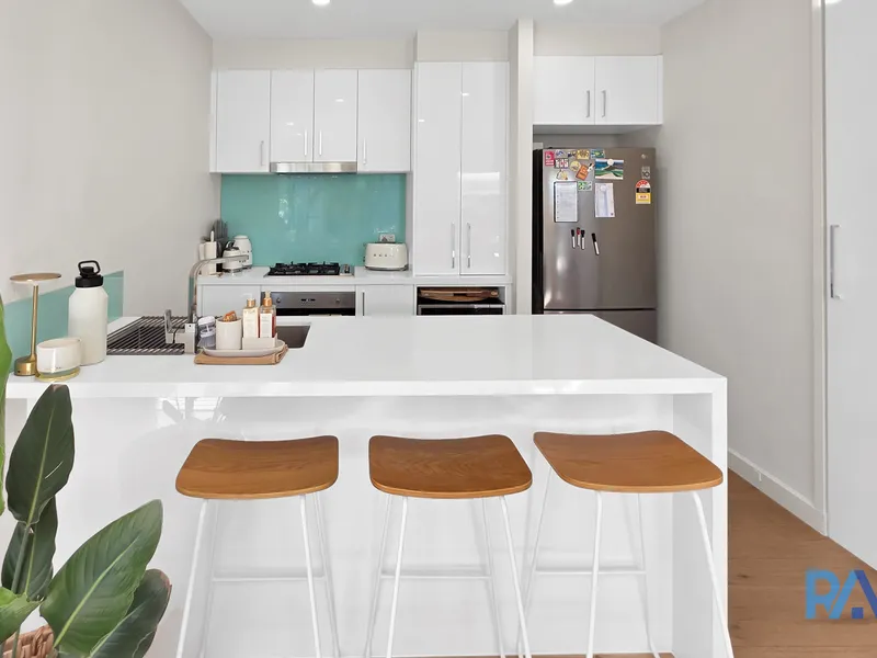 The thoughtfully designed open-plan living, dining and kitchen area creates a seamless flow, enhanced by waterfall stone benchtops, glass splashbacks, Smeg appliances (including dishwasher), 2-pac cabinetry, soft-close drawers and a convenient breakfast bench. Sliding doors extend the living space onto a sunlit balcony, ideal for relaxing or entertaining.