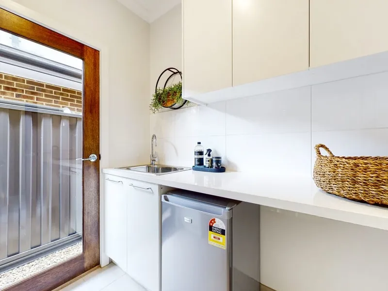 The modern kitchen is appointed with an island stone benchtop, pendant lighting, wall oven with grill/warmer, gas stovetop, walk-in pantry and plenty of storage space. The living and dining area are supported by split system heating and cooling, downlights throughout and plenty of natural lighting.