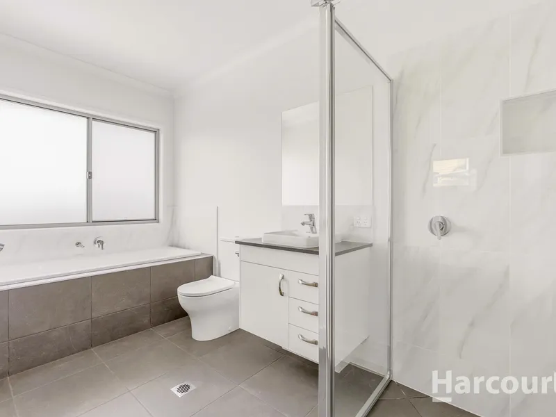 The main bathroom is equally impressive, showcasing quality fixtures and fittings, a full-sized bath, large shower, and toilet.