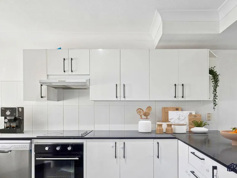• Renovated Designer Kitchen: Features premium stone benchtops, ample storage, electric cooking appliances, and a dishwasher.