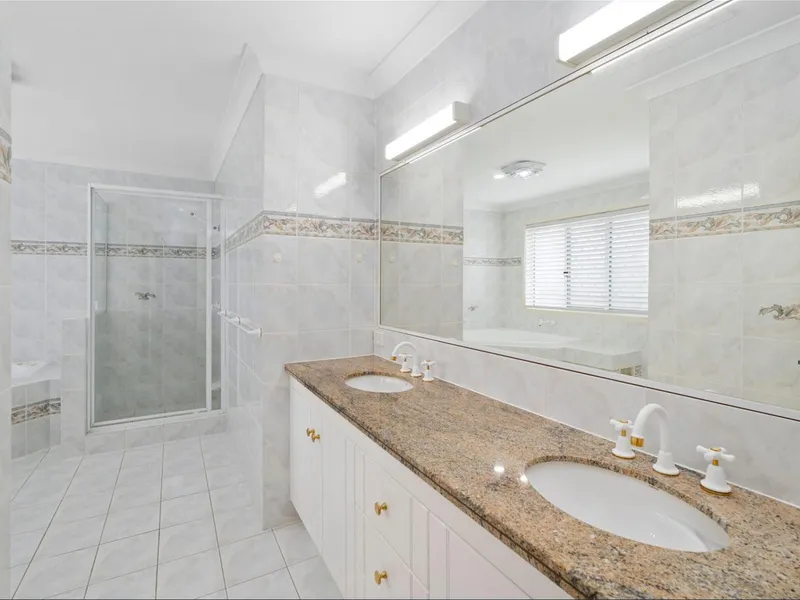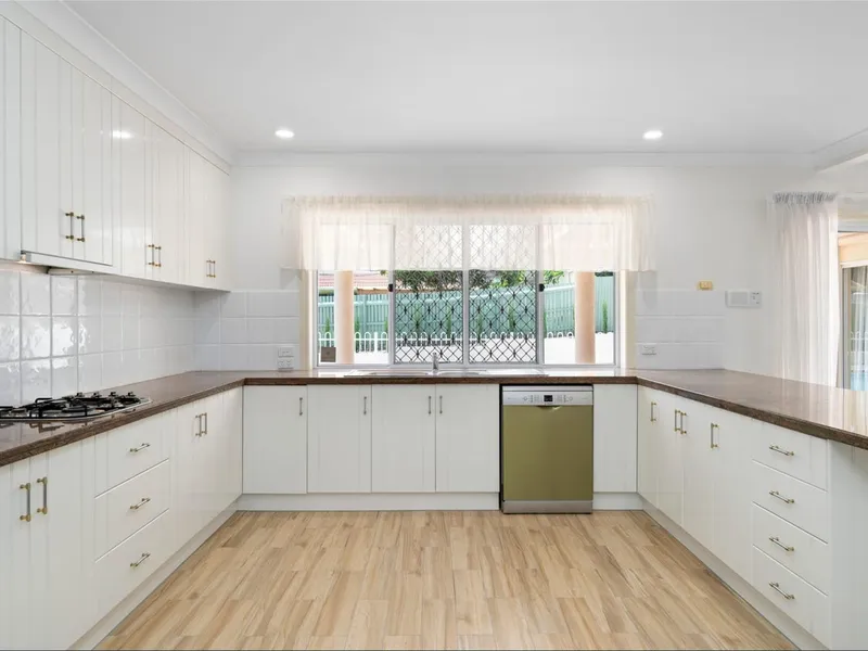 Features superior cabinetry, stone benchtops, breakfast bar, first-class appliances, gas cooktop, ample storage, and a large pantry.