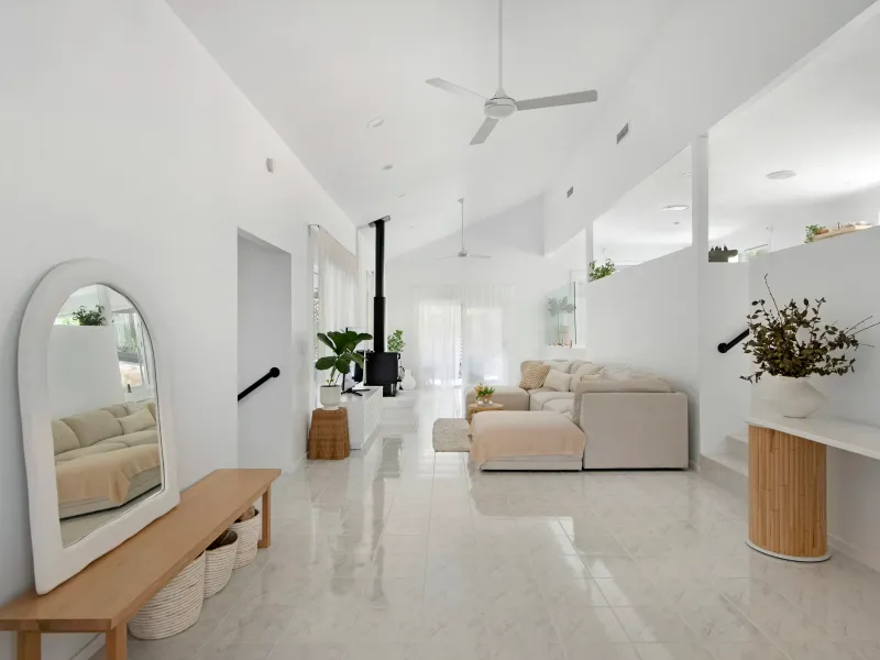 Inside, high ceilings and expansive open-plan living create an immediate sense of space and light. Split-level living zones are anchored by a cosy wood fireplace, while the newly renovated entertainer's kitchen with stone benchtops, induction cooktop and walk-in pantry makes hosting effortless. Sliding doors connect seamlessly to additional undercover decking and the sparkling in-ground pool framed by tropical greenery.