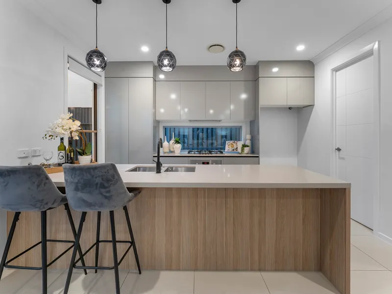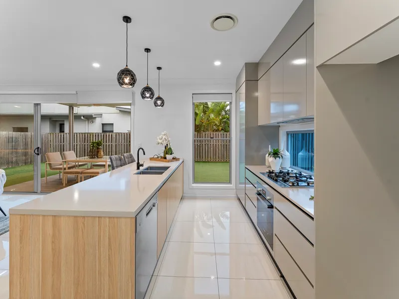 Step inside and experience a beautifully connected layout where the main living, dining and kitchen spaces flow together with ease. Soft natural light, quality finishes and thoughtful design create an inviting atmosphere ideal for both relaxed daily living and entertaining guests. The kitchen forms the centrepiece of the home, showcasing refined stone surfaces, premium appliances, generous cabinetry and a walk-in pantry that blends sophistication with practical function.