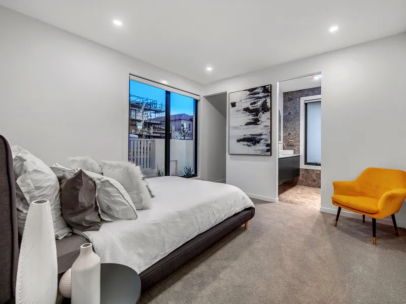 Finally you reach the peace du resistance, the luxe master suite of grand proportions, finished with VJ cladding, soft downlights, inbuilt entertainment unit, recessed headboard wall and sconce lighting. This room enjoys uninterrupted green views through luxurious linen drapes that open back to reveal the front balcony from which you can see the city skyline. The walk-in robe is housed in a room of its own with custom cabinetry on all sides providing an abundance of hanging and drawer space, open shelving to highlight your prize pieces, and an island of drawers finished with 40mm stone.