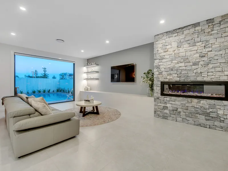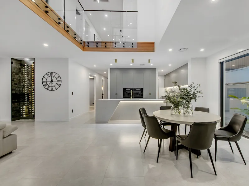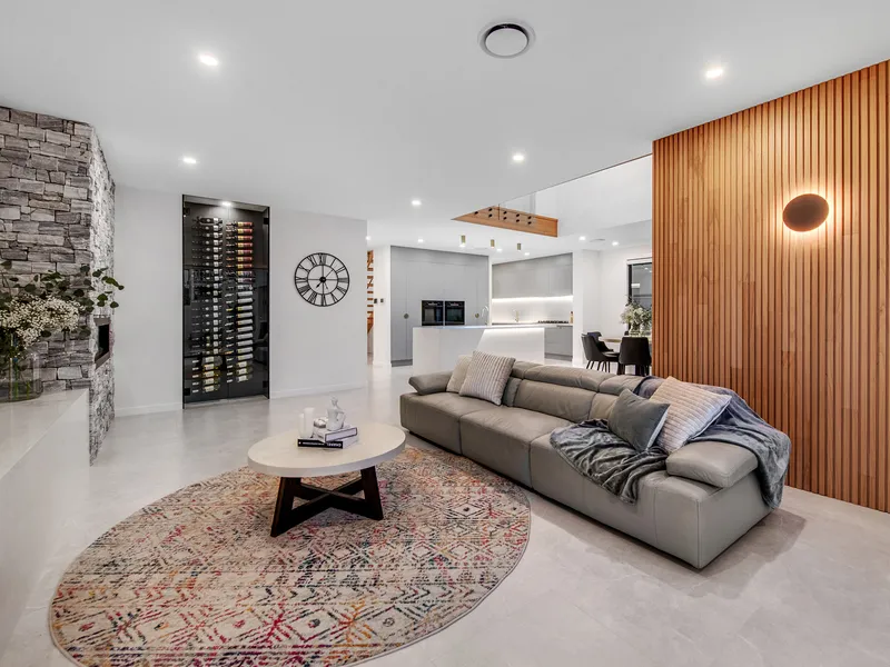 Back out in the living hub, with huge overhead void plus chandelier, the open plan living design effortlessly merges the spaces to create a sense of harmony. The 7 x 5m informal lounge offers a full wall of glass to look out over the pool and thoughtfully placed floor to ceiling wine cellar. This is finished with an electric fireplace set into the hand-laid stone stacker wall. The dining area offers plenty of space to entertain with ease and is complimented by a second full wall window through to the garden.