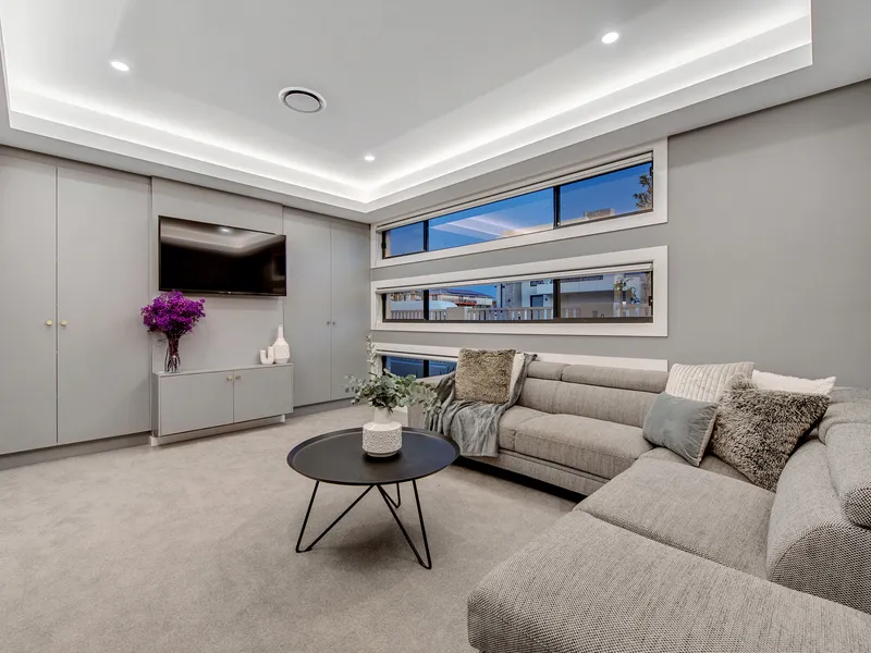 Around the corner off the hall you'll find the huge powder room with floating vanity, stone benchtops, wall sconce and LED lowlighting, on-trend kitkat tiles and the toilet tucked behind a privacy wall. Continuing down the hall, 2.7m ceilings overhead and sleek 1.2m floor tiles underfoot, lead you further into the home. To your right is the huge media room with bulkhead and LED lighting plus floor to ceiling inbuilt cupboards.