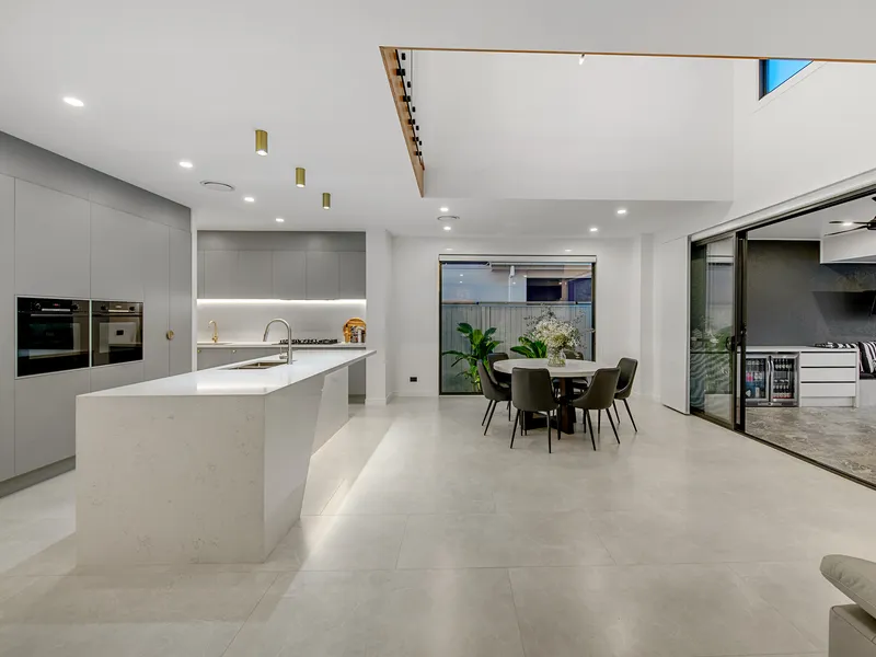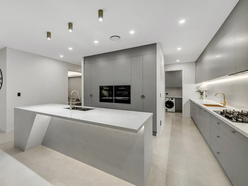 To your left beckons the luxe kitchen that has to be seen to be believed. Boasting the latest design features and high-end finishes, you'll lust after the full-length island bench with thick 40mm Carrera mist stone tops, sleek Bosch appliances and dual ovens. There are two double recessed sinks with brass fittings, a 5 burner gas cooktop and stone splashbacks plus integrated dishwasher and soft closing cabinetry. Hidden out of sight you'll find the full-sized butler's pantry with fridge, floor to ceiling cupboards and the same luxurious stone benchtops and splashbacks. These are illuminated again by soft LED lighting further enhancing the sense of opulence this home offers at every turn.