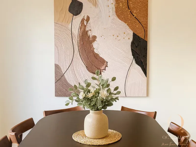 The living area finished with VJ cladding, provides another space to unwind away from the main living hub of the home and includes a wet bar and built-in cabinetry. Large glass sliding doors open out onto the glass enclosed balcony, perfect for your morning coffee or an afternoon aperitif overlooking your inviting swimming pool.