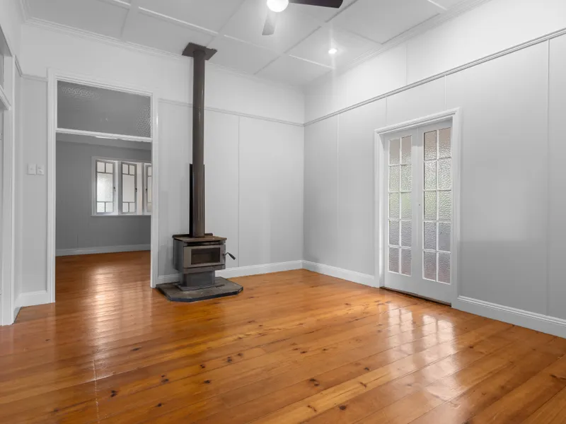The rumpus room is located at the rear of the home and provides a cosy space to unwind with a wood-fire heater, air-conditioning and access to the rear deck.
