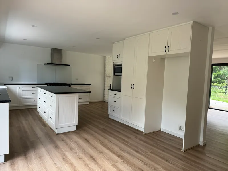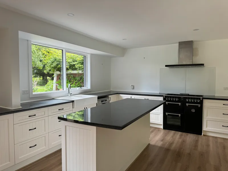 On entry, you are greeted with the standout kitchen; a country chic design of sleek black and white features with fixed island bench and a copious amount of storage.