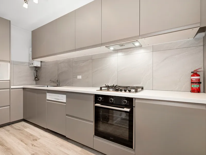 The kitchen with gas cook-top, electric oven and dishwasher is the heart of this home and boasts sleek cabinetry, ample storage, and contemporary finishes.