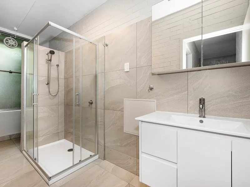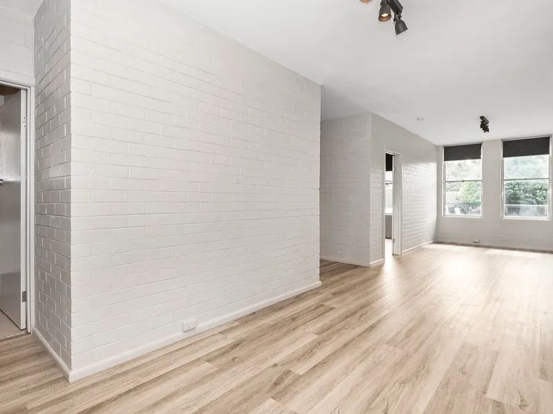 Two generous sized bedrooms feature wardrobes with mirror doors and plenty of storage, as well as a stylish bathroom including updated fittings and fixtures, a large shower and private laundry facilities.