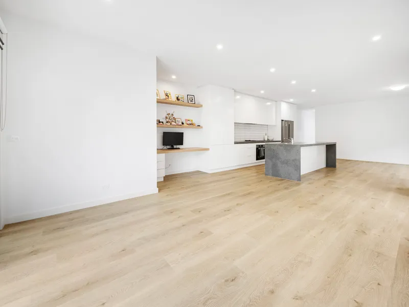 The contemporary kitchen is well-appointed with quality finishes and ample storage, flowing seamlessly into the dining and living area. The master bedroom includes a private ensuite, while the additional bedrooms are well-sized and serviced by a modern central bathroom.