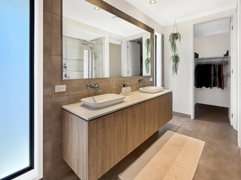 The main bedroom has been thoughtfully designed as a private retreat, complete with two walk-in robes and a spacious ensuite featuring double vanities, a large shower and a separate toilet. The second bathroom is equally practical for family living, offering both a bath and separate shower.